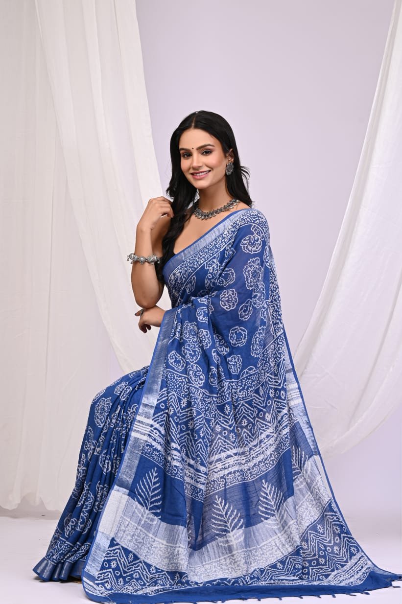 Experience the charm of traditional craftsmanship with our elegant hand block printed linen sarees, designed for women who love timeless style with a modern touch.